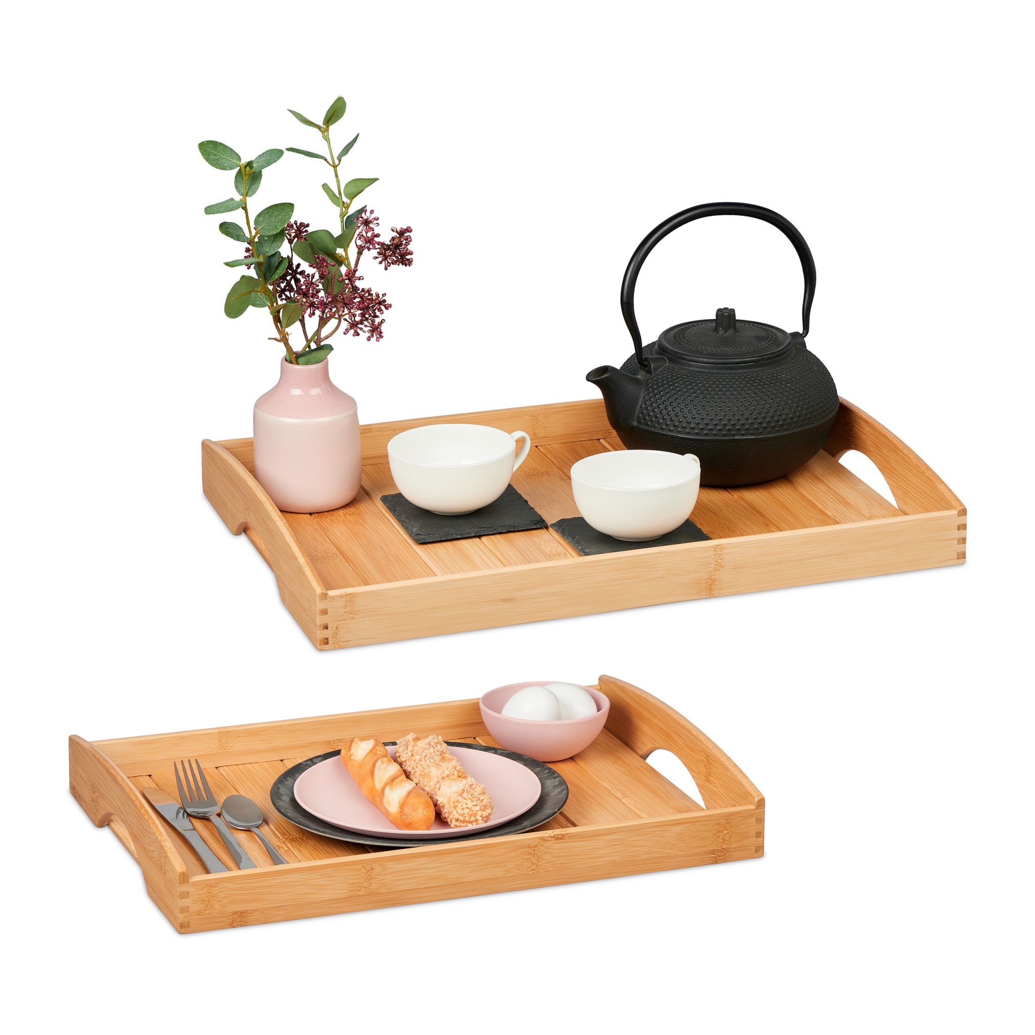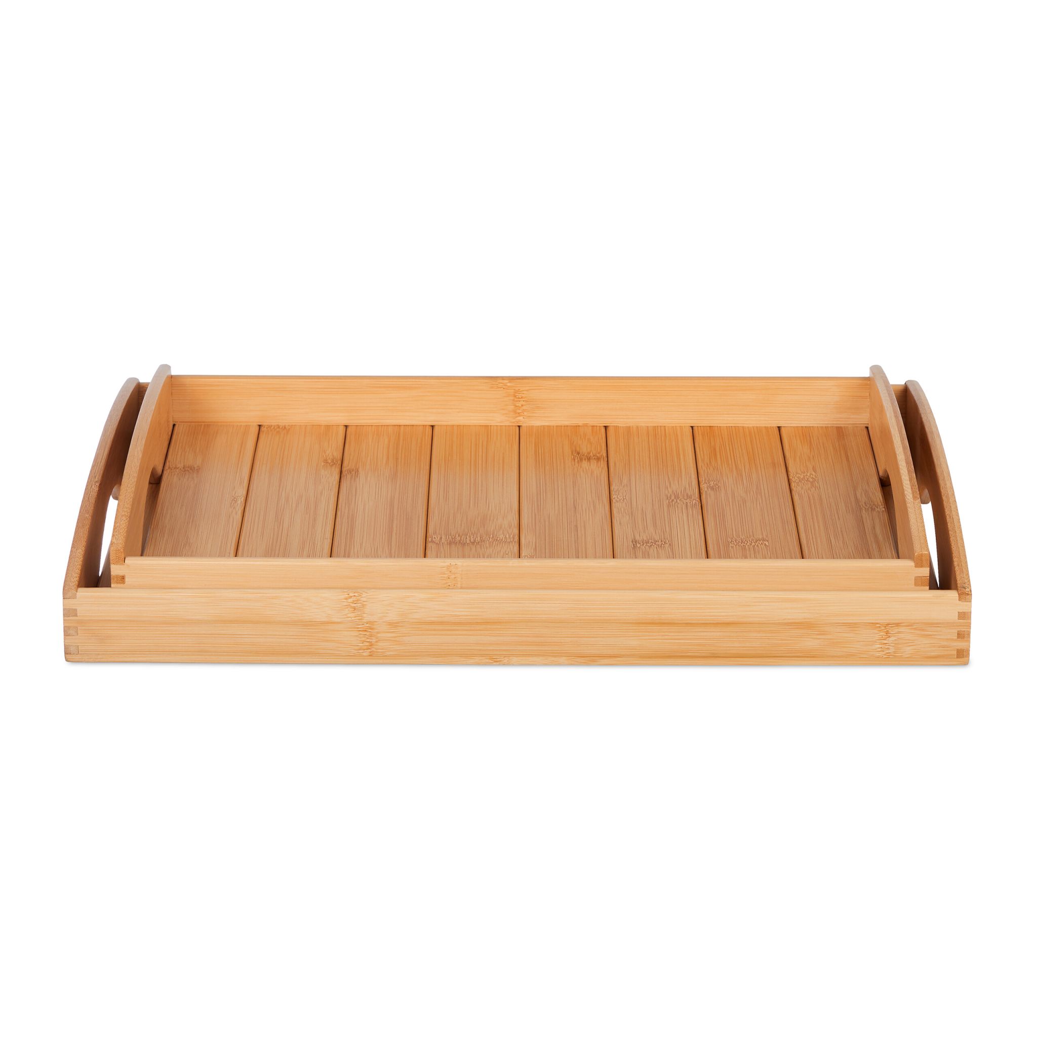 Tace do serwowania w 2 różnych rozmiarach wygodnie pomieszczą jedzenie, napoje i inne przedmioty. Stoliki zostały wykonane z naturalnego bambusa i są nie tylko funkcjonalnym, ale także dekoracyjnym dodatkiem do każdej kuchni. Wysoki rant sprawia, że naczynia i żywność są bezpieczne. Uchwyty po bokach umożliwiają łatwe przenoszenie i odkładanie tac kuchennych. Jeśli jednak coś się rozleje, stoliczki można łatwo wyczyścić wilgotną ściereczką.